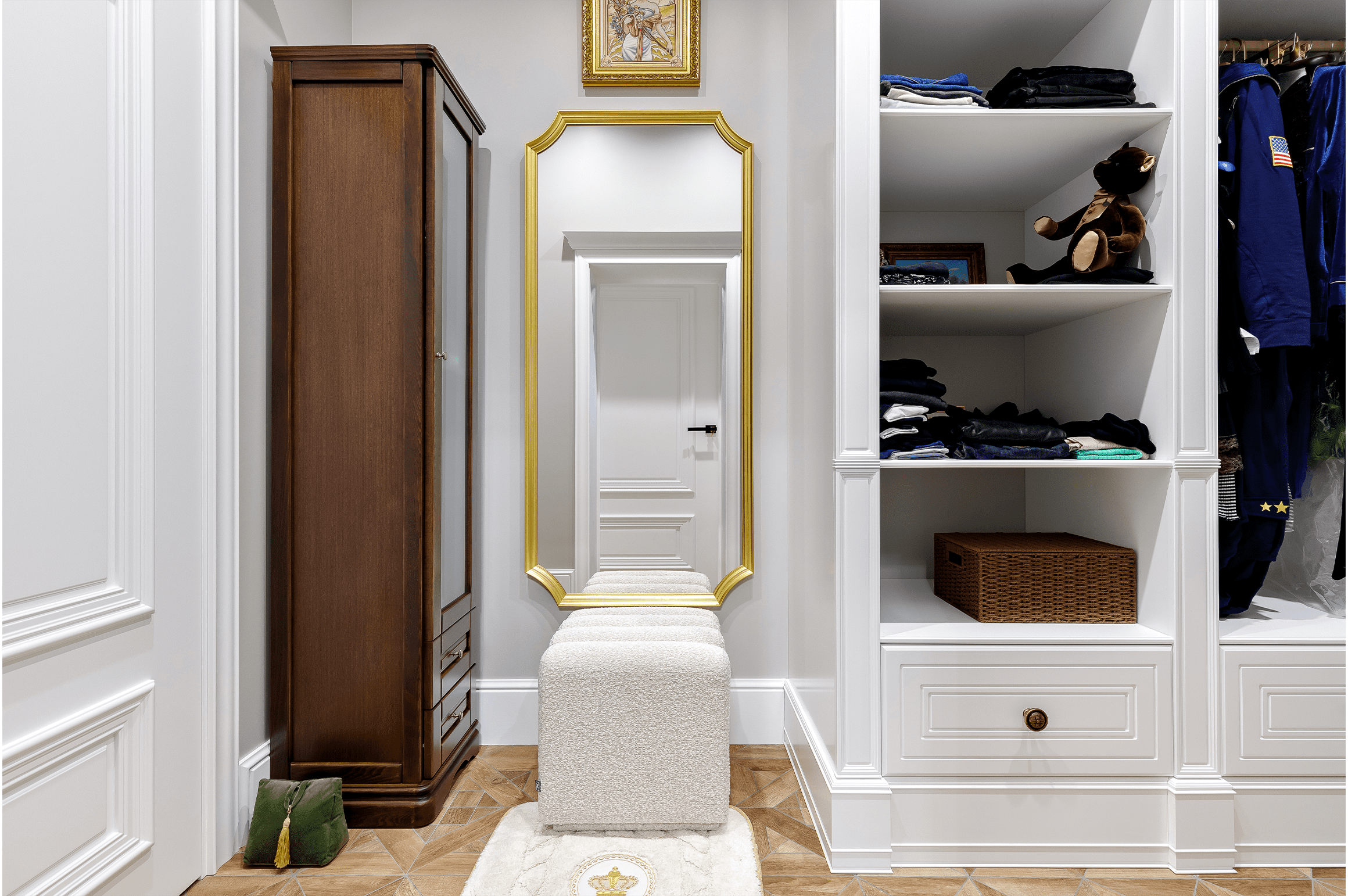 Для хранения обуви лучше всего использовать закрытые шкафы с вентиляцией. Это позволяет избежать скопления пыли и запахов. Для текущей пары обуви у входа подойдут поддоны или специальные стойки. Не забудьте про банкетку — удобное место для переобувания.