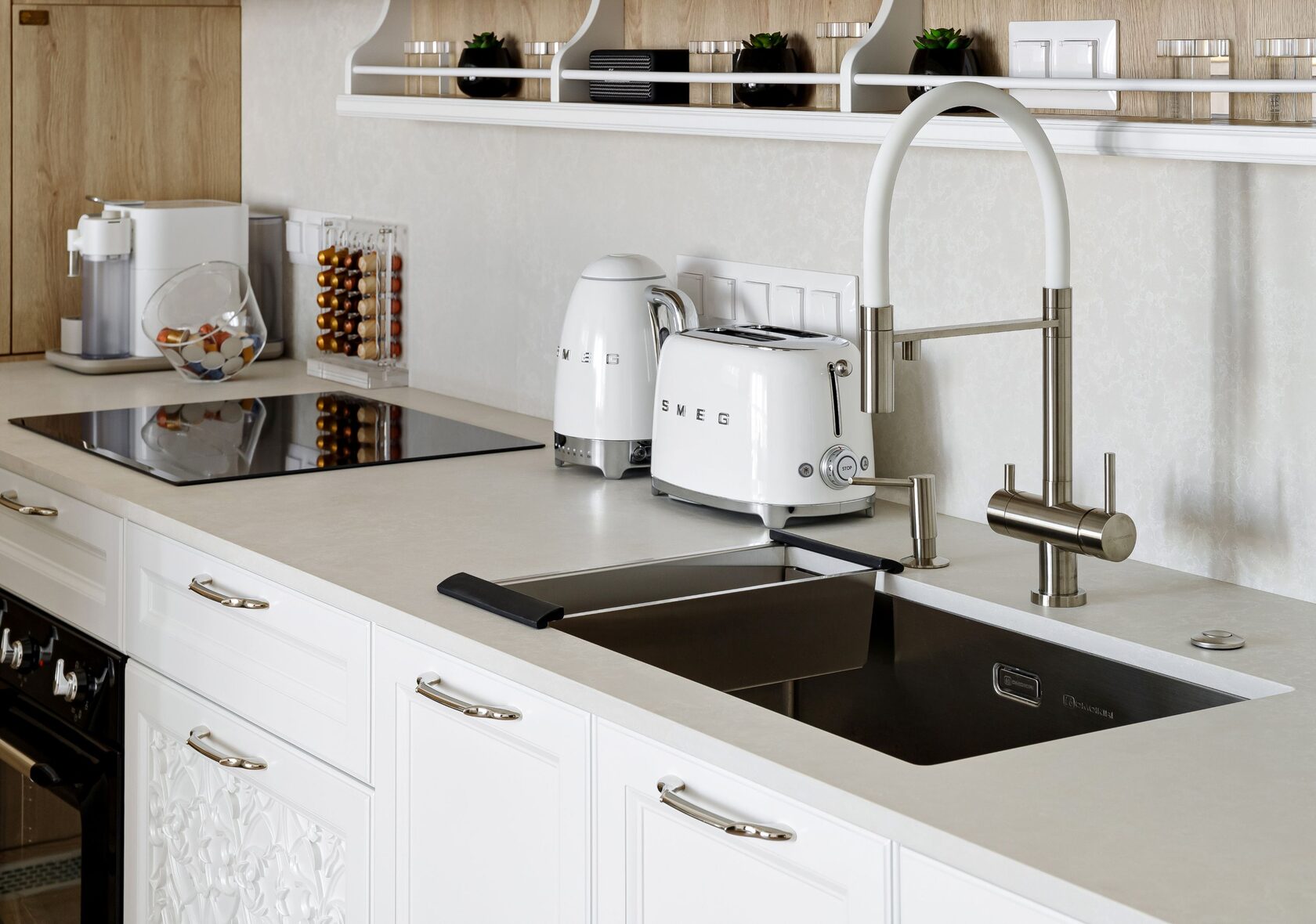 Встраиваемые аксессуары — дозаторы для мыла, измельчители отходов, дополнительные розетки — всё это легко размещается на просторной поверхности без компромиссов с функциональностью.